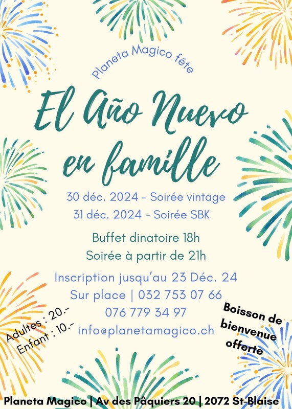 🎉 Célébrez le Nouvel An à Planeta Mágico ! 🎉 Envie de faire le passage à l'année 2025 d'une manière différente ? Alors tu es au bon endroit. ✨ Deux soirées magiques pour finir l’année en beauté : 📅 Lundi 30 décembre : Soirée Vintage Plongez dans une ambiance rétro inoubliable ! 🍴 Repas dès 18h 🕺 Soirée dansante à partir de 21h 📅 Mardi 31 décembre : Soirée SBK Dansez sur les rythmes de la Salsa, Bachata et Kizomba ! 🍴 Repas dès 18h 💃 Soirée dansante à partir de 21h 🎈 Pour un moment cool et réconfortant en famille, découvrez notre buffet magique ! Buffet chaud et froid végétarien, avec des options véganes et sans lactose. 100% fait maison avec des saveurs qui raviront petits et grands. Large choix de boissons chaudes et froides au bar. 🧾 Zéro gaspillage, zéro souci : Paiement au poids : Plats salés et certaines douceurs : 3,90 CHF les 100g. Autres douceurs sucrées : tarif à la pièce. Entrées : Adultes : 20 CHF Enfants : 10 CHF Inclus une boisson de bienvenue offerte Réduction pour les familles et les groupes 📌 Informations importantes : Inscription via le lien : https://docs.google.com/forms/d/e/1FAIpQLSeHB4twCKa1T9HIKLz0Yq0TF687Uu4AT7vujfhBGFRi4RFMRw/viewform Vous recevrez un e-mail ou un message de confirmation avec les détails et le montant exact de votre réservation sans le buffet et les boissons Paiement en cash uniquement sur place. Les boissons et nourriture de l'extérieur sont interdits 🌟 On se réjouit de vivre avec vous cette occasion unique de terminer 2024 et de commencer 2025 en beauté à Planeta Mágico ! 🌟