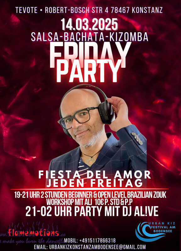 ΰΌ» π πππππ πππ ππππ ΰΌΊ πππππ π ππππππ πππππ β¦ Salsa β¦ Bachata β¦ Kizomba β¦ Taucht ein in die Welt der Musik und des Tanzes! Die Fiesta del Amor lΓ€dt euch zu einer unvergesslichen Nacht voller Leidenschaft, Freude und lateinamerikanischer Rhythmen ein. Ob Salsa-, Bachata- oder Kizomba-Fan β hier kommen Tanzbegeisterte zusammen, um gemeinsam zu feiern! π Wann? Jeden Freitag π Programm: 19 - 21 Uhr 2 Stunden Beginner & Open-Level Brazilian Zouk Workshop fΓΌr alle geeignet mit Ali 10β¬ P. Std - p.P 21:00 - 22:00 Uhr: BegrΓΌΓung mit einem Glas Sekt β stoΓt mit uns an! 21:00 Uhr: Party-Beginn β Die TanzflΓ€che gehΓΆrt euch! Unser DJ sorgt bis 02:00 Uhr fΓΌr die perfekte Mischung aus Salsa, Bachata und Kizomba. β¨ Eintritt: Der Eintritt auf Spendenbasis um die Gage des DJs und die Raummiete zu decken. πΉ Wichtiger Hinweis: Bitte bringt keine eigenen GetrΓ€nke mit. Unsere Bar bietet euch eine Auswahl an kΓΌhlen Drinks, um euren Abend perfekt zu machen. π Location: Robert-Bosch-StraΓe 4, 78467 Konstanz π Besondere Highlights: π Professioneller Tanzboden fΓΌr das ultimative TanzvergnΓΌgen π Kostenlose ParkplΓ€tze direkt vor Ort Verpasst nicht diese besondere Nacht! Tanzt, feiert und genieΓt die Fiesta del Amor mit uns β jeden Freitag! Wir freuen uns auf euch! π΄πΆππΊ https://www.facebook.com/share/1FXyTP7V6t/