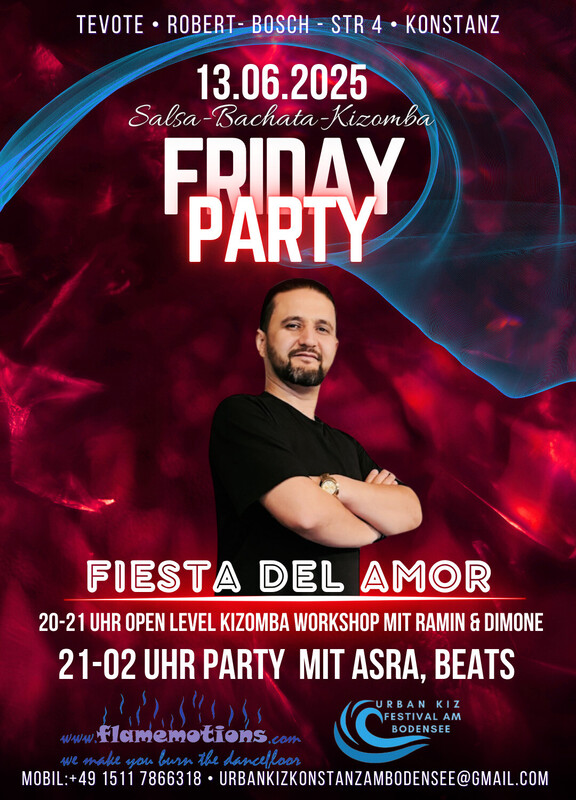 ΰΌ» π…πˆπ„π’π“π€ 𝐃𝐄𝐋 π€πŒπŽπ‘ ΰΌΊ 𝐉𝐄𝐃𝐄𝐍 π…π‘π„πˆπ“π€π† 𝐀𝐁𝐄𝐍𝐃 ❦ Salsa ❦ Bachata ❦ Kizomba ❦ Taucht ein in die Welt der Musik und des Tanzes! Die Fiesta del Amor lΓ€dt euch zu einer unvergesslichen Nacht voller Leidenschaft, Freude und lateinamerikanischer Rhythmen ein. Ob Salsa-, Bachata- oder Kizomba-Fan – hier kommen Tanzbegeisterte zusammen, um gemeinsam zu feiern! πŸ“… Wann? Jeden Freitag πŸ•– Programm: 20:00 Uhr: Workshop (Open Level – fΓΌr alle geeignet) 21:00 - 22:00 Uhr: Begrüßung mit einem Glas Sekt – stoßt mit uns an! 21:00 Uhr: Party-Beginn – Die TanzflΓ€che gehΓΆrt euch! Unser DJ sorgt bis 02:00 Uhr fΓΌr die perfekte Mischung aus Salsa, Bachata und Kizomba. ✨ Eintritt: Der Eintritt auf Spendenbasis um die Gage des DJs und die Raummiete zu decken. 🍹 Wichtiger Hinweis: Bitte bringt keine eigenen GetrΓ€nke mit. Unsere Bar bietet euch eine Auswahl an kΓΌhlen Drinks, um euren Abend perfekt zu machen. πŸ“ Location: Robert-Bosch-Straße 4, 78467 Konstanz 🎊 Besondere Highlights: πŸ’ƒ Professioneller Tanzboden fΓΌr das ultimative TanzvergnΓΌgen πŸš— Kostenlose ParkplΓ€tze direkt vor Ort Verpasst nicht diese besondere Nacht! Tanzt, feiert und genießt die Fiesta del Amor mit uns – jeden Freitag! Wir freuen uns auf euch! πŸŒ΄πŸŽΆπŸ’ƒπŸ•Ί https://www.facebook.com/share/19MaTGY6VH/
