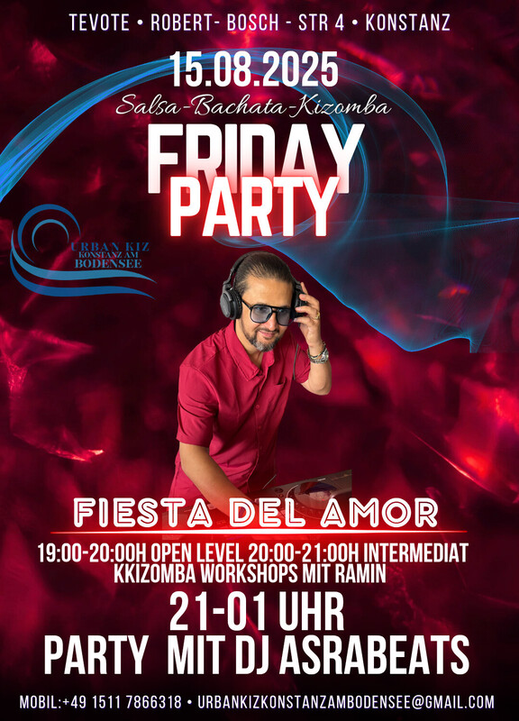 ππ FIESTA DEL AMOR β JEDEN FREITAG IN KONSTANZ πΊπΆ π Tevote, Robert-Bosch-StraΓe 4, 78467 Konstanz π π 19:00 β 21:00 Uhr: π§‘ Zwei Kizomba-Workshops mit Ramin πΊ πΈ Open Level & Mittelstufe β Du hast donnerstags keine Zeit fΓΌr unsere regulΓ€ren Kurse? Dann nutze jetzt die Chance und sei freitags dabei! ππ π° Ein Workshop: 15 β¬ Β· Beide Workshops: 25 β¬ β¨ FΓΌr regulΓ€re Kursteilnehmer sind die Workshops kostenlos! ππ₯ π Ab 21:00 Uhr: π§ Fiesta del Amor β Party mit DJ ASRA BEATS πΆ π Salsa Β· πΊ Bachata Β· π Kizomba π₯ HeiΓe Rhythmen β Coole Moves β gute Stimmung! ππ Kommt vorbei, bringt eure Energie mit und tanzt mit uns ins Wochenende! ππΊ Wir freuen uns auf euch! ππ₯β€οΈ π± Mehr Infos: π +49 1511 7866318