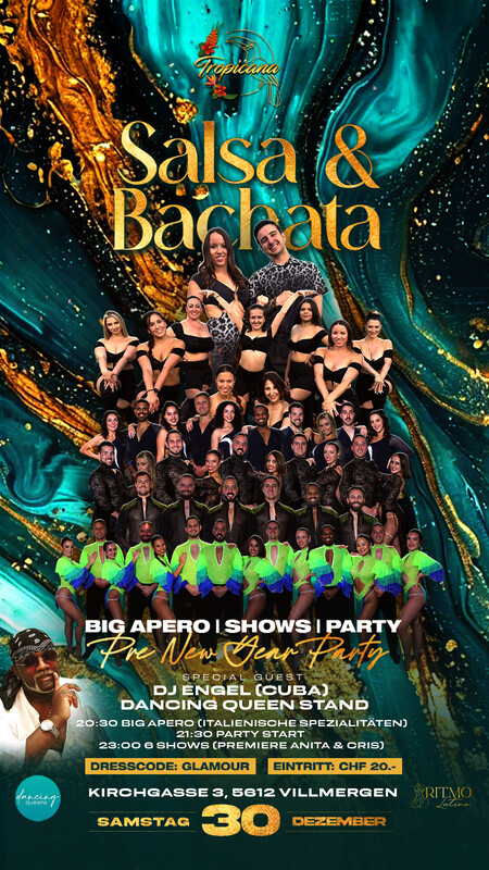 *** PRE NEW YEAR PARTY *** *** SALSA | BACHATA *** *** BIG APERO (ITALIENISCHE SPEZIALITÄTEN) *** *** 6 SHOWS (PREMIERE ANITA & CRIS) *** *** DJ ENGEL (CUBA) *** SPECIAL GUEST  DJ ENGEL (CUBA) & DANCING QUEEN BIG APERO 20:30-21:30 ITALIENISCHE SPEZIALITÄTEN & KUCHEN DANCING QUEEN STAND (SCHUHE FÜR GIRLS & BOYZ) PARTY START 21:30Uhr – DJ ENGEL (SALSA & BACHATA) SHOWS 23:00 – SHOW TEAMS (RITMO LATINO) TICKET: 20 CHF DRESSCODE:GLAMOUR Lass dich entführen und geniesse die atemberaubende Magie der Event Location im Herzen vom Aargau in Villmergen! Es erwartet dich ein Spektakel mit bezaubernden Shows. ​ ===VILLMERGEN === Kirchgasse 3 | 5612 Villmergen https://tropicanaclub.ch/next-events.html