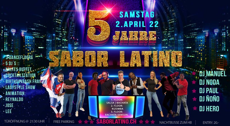 😍😍 5 Jahre Sabor Latino!!😍😍 Das muss doch gefeiert werden. 🔥 Auf 3 Dancefloors legen die 5 DJ`s auf, die uns über die Jahre begleitet und unterstützt haben. 🔥 Ladystyle Show der Tanzschule bailemos 🔥 Animation mit Jose, Reynaldo und Lee 🔥 Birthdaybash Franz u. Nina 🔥 Cocktailstation 🔥 Fingerfood 🔥 Top Tänzer und Tänzerinnen Entry: 20.- Genügend freie Parkplätze vor dem Club. Es darf auf allen freien Flächen auf dem Gelände geparkt werden. Nur die Plätze vor den beiden Häusern links nach der Einfahrt in die Werkstrasse und die mit “Borsalino” gekennzeichneten Plätze visavis vom Sabor Latino sind tabu. Mehr über den Club erfährst Du hier: Im Club Sabor Latino wird die Nacht zum einmaligen Event. https://saborlatino.ch/event/5-jahre-sabor-latino/