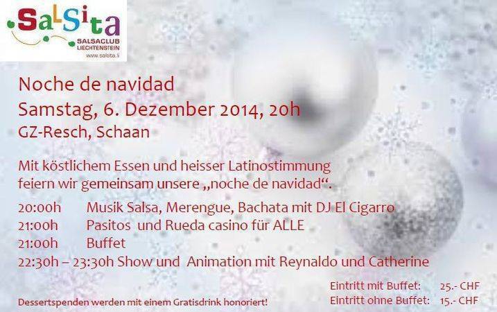 Salsita veranstaltet zum Abschluss der Saison eine Weihnachtsparty mit Buffet. Die Musik an diesem Abend legt DJ Cigarro auf. Es erwartet Euch ein feines internationales Buffet mit Vor-, Hauptspeisen und Dessert. Anschliessend geht es weiter mit Salsa, Bachata, Kizomba, Merengue bis tief in die Nacht. Wo: Gemeinschaftszentrum Resch, 9494 Schaan Wann: Samstag, 06. Dezember 2014 ab 20.00 Uhr Musik: DJ Cigarro Eintritt inklusive Buffet: CHF 25.- Eintritt ohne Buffet: CHF 15.- Programm: ab 20.00 Uhr Barbetrieb mit Musik 21.00 Uhr Pasitos und Rueda casino für ALLE 21.00 Uhr Buffet 22.30 Uhr – 23.30 Uhr Show und Animation mit Reynaldo und Catherine