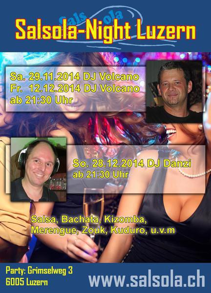 Salsa, Bachata, Kizomba, Merengue, Zouk, Kuduro, u.v.m Wir freuen uns, euch bei unseren Parties im Zentrum von Luzern zu begrüssen. Eintritt: Fr. 10.- Mitglieder: Fr. 6.- Jeden Abend kannst du am Wettbewerb teilnehmen. Es werden jeweils drei Preise jeden Monat verlost! weitere Daten: Fr. 12.12.2014 Fr. 28.12.2014 jeweils ab 21:30 Uhr http://www.salsola.ch