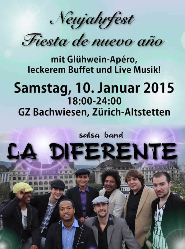 Am 10. Januar 2015 steigt wieder unser grosses Neujahrsfest mit Glühwein-Apéro, leckerem Buffet und Live Band LA DIFERENTE (Latin-Jazz, Salsa, Bachata und mehr). Wer das letzte mal dabei war weiss, dieses Fest darf nicht verpasst werden! Im Unkostenbeitrag von 60.- ist alles inklusive (Buffet mit Ceviche und vielem mehr, Getränke (Wein, Bier, Softdrinks) Der Vorverkauf ist ab sofort eröffnet. Natürlich sind auch deine Freunde willkommen. Wir freuen uns auf dich! Belinda und Nando Wann: Samstag, 10. Januar 2015, 18:00-24:00 Wo: GZ Bachwiesen, Bachwiesenstrasse 40, 8047 Zürich-Altstetten Am besten von Bahnhof Altstetten mit dem Bus 80 bis Haltestelle Untermoosstrasse Anmelden: per facebook, per email: lostenorios@bluewin.ch Para los amig@s que deseen venir un poco mas tarde, tendrán la opción de venir a partir de las 21:00 después del bufete y disfrutar de buena música en vivo con la banda La Diferente. Por el valor de 45 Fr.- ESTO INCLUYE TAMBIÉN LAS BEBIDAS a discreción y un postre para endulzar aun mas la noche. Les esperamos, saludos Nando & Belinda https://www.facebook.com/events/893806417298976/
