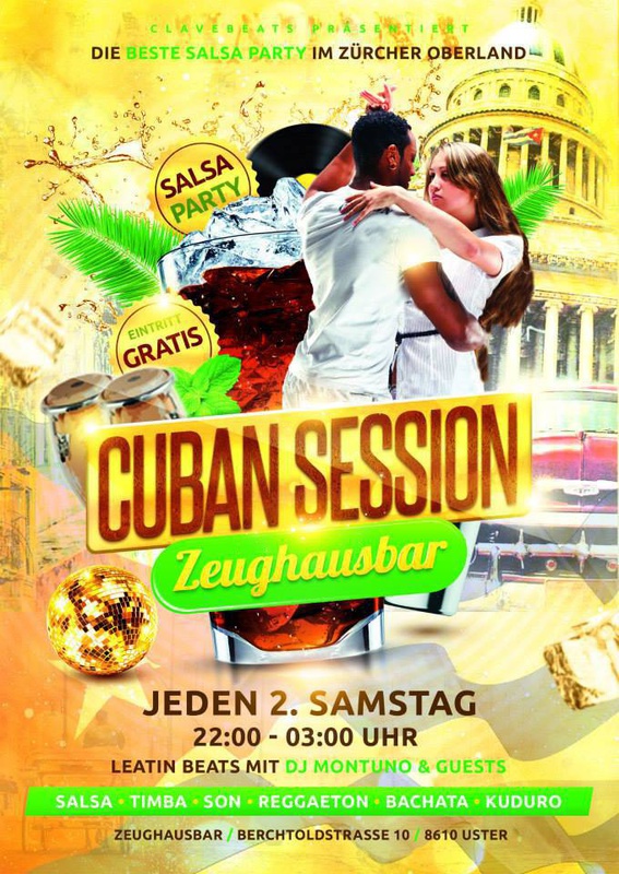 Eine Party für Tänzer und Geniesser... CUBAN SESSION ist eine SALSA PARTY im ZH-Oberland. Seit über zwei Jahren mit der besten kubanischen Musik mit DJ Montuno & Guests! Mit CUBAN SESSION bieten wir euch EINMAL IM MONAT eine einzigartige, atemberaubende Reise durch die verschiedenen lateinamerikanischen Rhythmen in einer der schönsten Locations im Kanton Zürich! ¸¸.•*¨*•♫♪¸¸.•*¨*•♫♪¸¸.•*¨*•♫♪¸¸.•*¨*•♫♪¸¸.•*¨*•♫♪¸¸.•*¨*•♫♪¸¸.•*¨*•♫♪ ClaveBeats & Zeughausbar Uster präsentieren: CUBAN SESSION mit DJ Montuno & Guests Salsa, Timba, Son, Rumba, Reggaeton, Bachata, Kizomba, Merengue & Kuduro Gratis Eintritt Viele Parkplätze CUBAN SESSION Event-Daten 2015: 10. Januar Location: Zeughausbar Uster Berchtoldstrasse 10 8610 Uster Web: www.zeughausbar.ch FB: https://www.facebook.com/zeughausbar ClaveBeats: https://www.facebook.com/clavebeats FOTOS: Cuban Session 13.12.2014 https://www.facebook.com/media/set/?set=a.333182636874131.1073741840.233647013494361&type=3 Cuban Session 8.11.2014 https://www.facebook.com/media/set/?set=a.319749714884090.1073741839.233647013494361&type=3 Cuban Session 13.09.2014 https://www.facebook.com/media/set/?set=a.299273940265001.1073741838.233647013494361&type=3 Cuban Session 16.08.2014 https://www.facebook.com/media/set/?set=a.282611608597901.1073741837.233647013494361&type=3 Cuban Session 07.06.2014 https://www.facebook.com/media/set/?set=a.249303421928720.1073741833.233647013494361&type=3