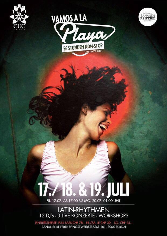 CUC EVENT und Salsarica präsentieren in der Bananenreiferei in Zürich am 17./18. und 19. Juli 2015 "Vamos a la Playa", DIE 56 Stunden Nonstop-Party! Erlebt während drei Tagen und drei Nächten ein musikalisches Feuerwerk in einem einzigartigen karibischen Ambiente! Dies wird ein einmaliger und unvergesslicher Sommer mit "Vamos a la Playa", die noch nie zuvor dagewesene Nonstop-Party in Zürich. Drei Konzerte "a lo latino" 12 Djs Unzählige Workshops Mediterrane Köstlichkeiten Und vieles mehr... Eintrittspreise: Full Pass CHF 78.00 ihr spart 25%! Freitag CHF 39.00 Samstag CHF 39.00 Sonntag CHF 25.00