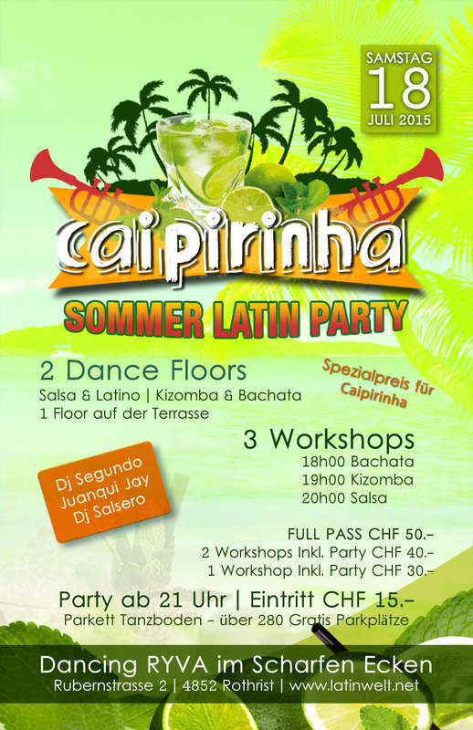 Der Sommer ist da! Tanz mit uns unter freiem Sternenhimmel und geniesse dazu einen erfrischenden Caipirinha oder andere Cocktails. Die ultimative Sommerparty findet auf 2 Dance Floors statt, 1 Floor auf der Terrasse! Salsa & Latino / Kizomba & Bachata Spezialpreis für Caipirinha 3 Workshops: 18h00 Bachata 19h00 Kizomba 20h00 Salsa ab 21h00 Party Dj Segundo (SO), Juanqui Jay (SG), Dj Salsero (BE) Full Pass (3 Workshops inkl. Party) CHF 50.- 2 Workshops inkl. Party CHF 40.- 1 Workshop inkl. Party CHF 30.- Nur Party CHF 15.- Parkett Tanzboden über 280 Gratis Parkplatz Dancing RYVA im Scharfen Ecken Anmeldung für die Workshops: anmeldung@latinwelt.net weitere Infos: info@latinwelt.net www.latinwelt.net * Die Party findet auch bei schlechtem Wetter statt.
