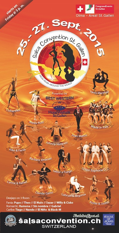 St. Gallen im Tanzfieber vom 25. bis 27. September im Olma Areal Eines der grössten Tanz-Spektakel in der Ostschweiz feiert sein 6 Jahres- Jubiläum Die Salsa Convention – ein Festival erster Klasse. Tänzer und Tänzerinnen mit Rang und Namen zeigen vom 25. bis 27. September 2015 in den Olmahallen ihre Tanzkunst; Allen voran die 4-fachen Salsa Weltmeister aus Brasilien Rafael Barros & Carine Morais und der Modern Jazz Tänzer Yanis Marshall, bekannt aus der Casting Show Britains Got Talent und fast schon ein Pionier des High Heels Tanzes als Mann. Rund 60 Artisten/innen und DJ‘s aus 12 Nationen werden diesen Abend bereichern. Ein eindrückliches Spektakel, gekennzeichnet durch Eleganz und Leidenschaft, wird die 2500 erwarteten Besucher begeistern. Profis aus verschiedenen Ländern sowie nationale Tanzschulen werden ihr Können in Tanz- und Workshops Interessierten weitergeben. Von Salsa, Hip Hop, Modern bis über Disco Fox für jeden Geschmack ist etwas dabei. Das Showprogramm am Abend wird die Besucher mitreissen. Besucher aus aller Welt treffen sich an der Salsa Convention in St. Gallen. Die heissen Rhythmen werden auf der Tanzfläche in die harmonischen Bewegungen des Lateinamerikanischen Tanzes umgesetzt. Verschiedene Verkaufsstände mit Artikeln aus dem Tanzbereich, der Barbetrieb und die kulinarischen Köstlichkeiten im Restaurant Rosso gehören auch zum Festival Angebot. Freitagabend Das Motto am Freitag heisst „ Dirty Dancing“, passend zum Film Klassiker kleiden sich alle so wie damals und lassen diese Zeit nochmals aufleben. Samstagabend Burlesque, smart aber auch sinnlich geht es am Samstagabend weiter. Der Name Burlesque stammt vom italienischen Wort burla für „Schabernack“, Theater und Parodie stehen an erster Stelle. Der Fantasie sich so zu kleiden wie in den 20er Jahren sind keine Grenzen gesetzt. Über 50 Workshops und Live Shows mit · Johnny Vazquez, Pionier L.A.-Style on 1 · Barbara Jimenez, Kubanischer Ladystyle · Yanis Marshall Welt Modern Jazz & Hip Hop Star (High Heels Tänzer) · Antonis und Hara, Weltmeister im Kizomba Tanzstil · Chiquito mit seiner Tanzgruppe Dominican Power, Street Dance · Kork y Judith Spanien Bachata Welt Meister · AHA Tanzschule St. Gallen · Salsa Revolucion Basel · Fuego y Pasion Zürich · Salsa People Zürich · Marakuya Dance Company aus Gossau · Pole Motion Gossau · AHA Tanzschule St. Gallen · Angelo Cannistraci Schweizer- und Europameister Disco Swing Und noch viele mehr… Dance Floors auf über 2000 Quadratmetern Fläche namhafte DJ’s sorgen für das „Salsa fever around the lake“ · Pupo aus Mailand · DJ Sezar Norwegen · DJ Cisko Belgien · DJ Tazz Griechenland · DJ Tiago oder DJ El Niño aus Portugal Tickets sind ab sofort auf www.starticket.ch oder direkt unter www.salsaconvention.ch erhältlich. Link Homepage: www.salsaconvention.ch
