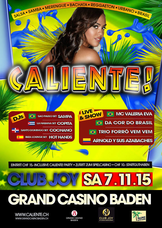 Das 20. Caliente-Festival anfangs Juli, im Kreis 4 in Zürich, war wieder ein fantastisches Fest! Damit wir von diesen tropischen Erinnerungen zehren können und für den Winter gerüstet sind, veranstaltet Caliente! am Samstag, 7.11.2015, ab 22.00 h, eine heisse Fiesta im Club Joy des Grand Casino Baden mit Liveacts und Top Latin DJs. Salsa, Brasil, Bachata, Merengue, Axé, Timba, Latin Hits, Funk Carioca, Reggaeton, Electrolatino, Urbano, MPB. Dance Floor im Club Joy, Musik im Eingangsfoyer und DJ im Grand Jeux. Live: Arnold y sus Azabaches, Trio Forró Vem Vem Show: Da Cor do Brasil Dancers DJs: Sampa - Copita – Hot Hands - Cochano MCs: MC Valeria Eva Das Ticket zur Party kostet CHF 15.-, darin inbegriffen sind auch der Eintritt in den Spielsaal Grand Jeux des Casinos + CHF 10.- Startguthaben. Weitere Informationen auf www.grandcasinobaden.ch und immer aktuell auf www.caliente.ch