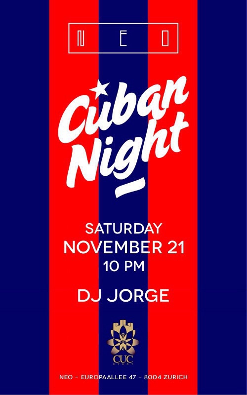 Die neue Salsa & Latin Party am Samstagabend! "Cuban Night" präsentiert von CUC Event Salsa, Cubana, Timba ,Cubaton, Bachata, und viel mehr ! mit die Besten Salsa & Latin DJ`s. Mit DJ Jorge Türöffnung: 22:00h - 04:00h Eintritt CHF 10.- LOKAL: NEO Bar Europaallee 47- 8004 Zürich Infos & reserviere deine Lounges: cucevent@bluewin.ch Tel: 078 783 21 26 Denys und Carlos wünschen euch viel Spass