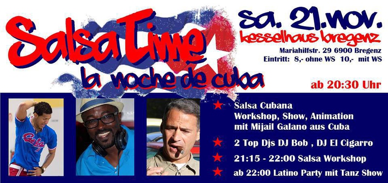 Der In Havanna geboren und in der Schweiz leben international bekannte Tanzlehrer, Showmeister, Mijail Galano Mesa, ist zu erstemal in Vorarlberg mit atmenberaubende Show und Animation. 2 Top Djs, Dj Bob & Dj Cigarro werden mit Salsa, Bachata, Kizomba,Merengue, Reggaeton, für ein karibisch Feeling sorgen. 8,- Euro (ohne WS). 10,- Euro (mit WS).