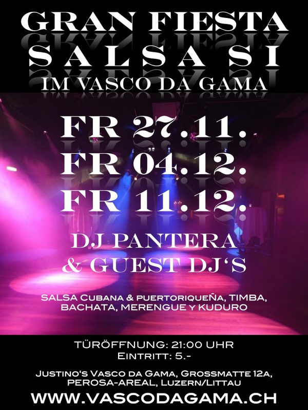 Fiesta SALSA SI im Justino’s Vasco Da Gama, Luzern/Littau an drei aufeinanderfolgenden FREITAGEN: 27. November, 4. Dezember und 11. Dezember mit DJ PANTERA SALSA (alle Stile), TIMBA, CUBATON, BACHATA, MERENGUE, KUDURO Wir freuen uns auf eine tolle Salsaparty mit euch in der neuen "alten Frigorex" Eintritt: CHF 5.- Justino’s Vasco Da Gama Grossmatte 12 a Perosa-Areal 6014 Luzern/Littau www.vascodagama.ch