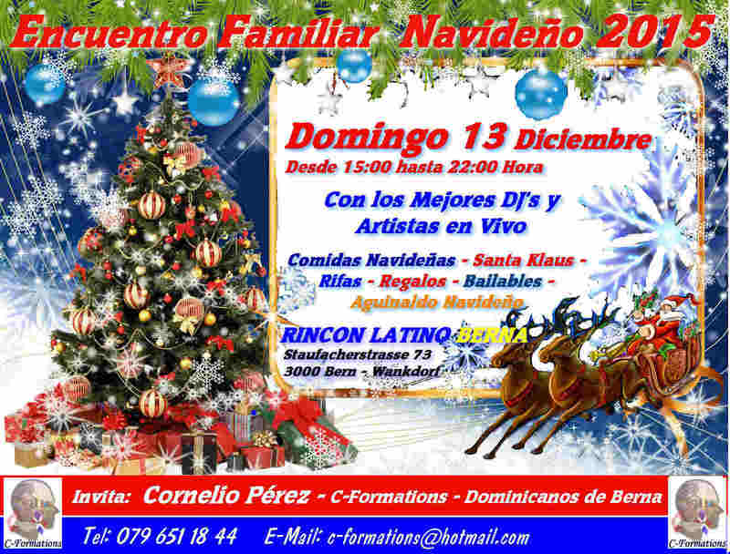 La fiesta navideña tradicional de los dominicanos con todos sus amigos multinacionales y sus familiares. Vamos para 15 años ininterrunpidos han hecho de este evento, un ejemplar y propicio espacio para unir a todos en familia y disfrutar durante una tarde del espiritu de la navidad. *** Nuestros Artistas invitados y el Aguinaldo Navideño**** Armando Mendez (Ticino), George Franco (Thun), Freddy Sax (Zürich), Ruddy Timbal (New York), Gabriel Disla (Swing Unico-Berna), Luis Muñoz (Berna), Carlos Moreno (DJ Alegria) y Horlando (Olten) y todos los amigos que se integraron al aguinaldo -Como Siempre: El tradicional almuerzo navideño para toda la familia a precios justos. Con Jesus y Felo (Masters Chef) - Los Mejores Artistas y DJ Latinos(Dj Luis 23 y Dj Vakero ambos de Berna) de todas las regiones vienen y brindan sus talentos para deleitar a grandes y chicos. -Juegos para niños con personajes de Disney World, Santa Klaus, Rifas y Regalos Carmen y sus Amiguitos (Animaciones para Fiestas Infantiles). Todo comienza a las 3 de la tarde y termina a la 10 de la noche, para que todos disfruten saluden a sus amigos y se diviertan en familia. Les esperamos para saludarles y desearles una feliz navidad en union familiar y mucha prosperidad en el nuevo año 2016. Bendiciones para todos... Cornelio Perez C-Formations Dominicanos de Berna 079 651 18 44 c-formtions@hotmail.com