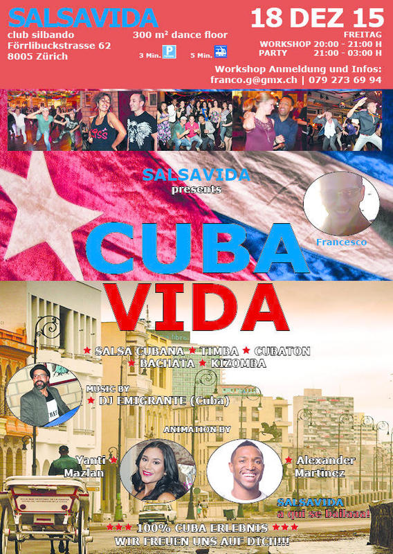 DORT WO DAS FEUER TANZT! SALSAVIDA presents https://www.facebook.com/events/1498004373837906/ ★★★★★ CUBAVIDA PARTY★★★★★ ▶ 18 DEZEMBER / SALSAVIDA in CLUB SILBANDO / ZÜRICH◀ ● MUSIC BY DJ Emigrante (Cuba) ● ANIMATION BY Alexander Martinez und Yanti Mazlan ★★★Friday Night is SALSAVIDA Night★★★ Bienvenidos Salser@s, Salsavida präsentiert ein neues Partylabel im Herzen von Zürich mit vielen Artisten, Künstler und Animation aus der grössten und vielseitigsten karibischen Insel CUBA, der Schweiz und Europa. Auf der 300m2 grossen Pista im Club Silbando mit kubanischem Flair und multikulturellem Ambiente wird durch die besten DJ’s der Salsa und Latin Musik ordentlich performt und eingeheizt. Eine unvergessliche Tanznacht, Spass, Freude und Unterhaltung ist dabei garantiert! Wir freuen uns auf DICH! Saludos Salsavida… A qui se bailaaa!!! Francesco Salsavida & Team WORKSHOP Ladies und Men Style Cubano Open Class Alexander Martinez und Yanti Mazlan Freitag 20:00 -21:00 H |18 DEZ 15| WS + Party CHF 30.- Only WS CHF 20.- Only Party CHF 15.- Workshop Anmeldung und Infos: franco.g@gmx.ch | 079 273 69 94 https://www.facebook.com/events/1930943767130235/ Salsavida in Club Silbando, Förrlibuckstrasse 62, 8005 Zürich Parkmöglichkeiten: Parkhaus Toni Areal 3 Minuten Parkhaus Zürich-West an der Förrlibuckstrasse 151 4 Minuten Gehminuten: Escher-Wyss-Platz – Silbando, 6 Minuten / Technopark – Silbando, 6 Minuten / Bahnhof Hardbrücke – Silbando, 12 Minuten