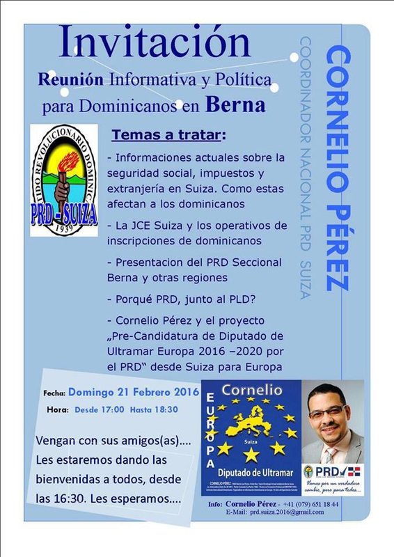 Cornelio Pérez (Coordinador Nacional del Partido Revolucionario Dominicano -PRD- junto a las delegaciones Cantonales del PRD en Suiza, invitan a todos los dominicanos y amigos de los dominicanos a participar del primer encuentro informativo y de orientación politica a realizarse en Berna la capital de esta Confederación Helvética. El encuentro se realizará el próximo domingo 21 de febrero del 2016, en la sala Grande de Eventos de la Mision Católica de Lengua Española de Berna, situada en la calle Sophiestrasse 5a, 3072 Ostermundigen -Bern-, a partir de las 16:30 de la tarde y finalizando a las 18:30. En el encuentro todos tendran la oportunidad de informarse sobre temas relacionados con la seguridad social en suiza, impuestos, desarrollo de la comunidad dominicana en Suiza, la presentación del PRD como una legitima institución político-social y democrática dominicana que siempre ha formado parte del dominicano en todas partes del mundo defendiendo los mejores principios de Quisqueya. Los organizadores hemos preparado un ápero de bienvenida para todos y esperamos contar con la asistencia de todos a este evento; dominicano, para todos los dominicanos...