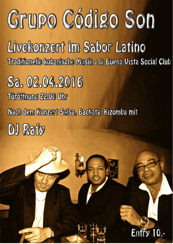 Wir dürfen im Sabor Latino in Winterthur wieder ein Livekonzert präsentieren. "Grupo Código Son" bestehend aus kubanischen und schweizer Musikern spielen traditionelle kubanische Musik a la Buena Vista Social Club. Natürlich werden auch einige aktuelle Hits nicht fehlen. Zum Konzert darf getanzt werden. In den Pausen und nach dem Konzert legt DJ Rafy auf. Türöffnung 22:00 Uhr Konzertbeginn: 22:30 Uhr Entry: 10.- www.saborlatino-club.ch