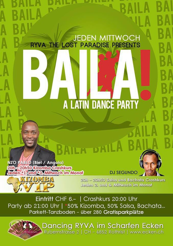 RYVA the Lost Paradise Presents: Dj Segundo und Amigos Jeden Mittwoch startet unsere Latin Party! Am 1. und 3. Mittwoch liegt der Fokus auf Kizomba mit dem Instruktor und Dj Nzo Pablo Kizomba, Salsa, Bachata, Cha cha cha, Merengue, etc. Salsa/Bachata/Kizomba Crashkurs zum Start ab 20:00 Uhr Der Kurs ist für Einsteiger und Fortgeschrittene geeignet. Party ab 21:00h Eintritt CHF 6.- Haben Sie eine Latinweltkarte oder Latino Card gewähren wir Ihnen gerne einen Discount. Erleben Sie schöne und glückliche Momente – jeweils Dienstag bis Samstag von 21:00 Uhr bis 2:00 Uhr. Nach dem Essen im Restaurant oder in der Pizzeria Fratelli schenken wir Ihnen den Eintritt. Top Djs - Parkett Tanzboden - über 280 Gratis Parkplatz Dancing RYVA im Scharfen Ecken Wir freuen uns auf Ihren Besuch - Jeden Mittwoch. Kontakt Dancing RYVA : Roger von Arx Tel.: 062 794 13 20 Kontakt Latinwelt: www.latinwelt.net info@latinwelt.net
