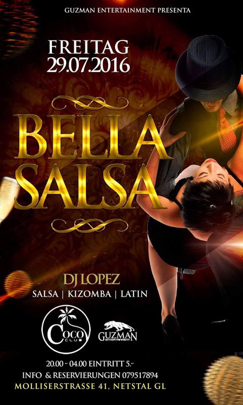 Guzman Entertainment & Coco Club Präsentieren; Freitag 29.07.2016 Bella Salsa Dj Lopez mit dem besten Salsa-Kizomba&Latin Hits 20.00 - 04.00 Uhr Eintritt 5.- Wir freuen uns, Sie begrüßen und verwöhnen zu dürfen. Info & Reservierungen 0795017894 Coco Club Molliserstrasse 41 8754 Netstal