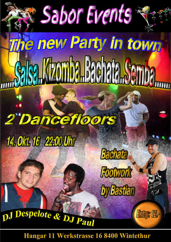 Die neue Party in Winterthur by Sabor Events mit 2 Dancefloors. Auf dem Salsafloor wird es richtig fetzen mit Salsa, Timba, Salsa Romanitca und natürlich sind auch ein paar Hits darunter. Auf dem Romantikfloor kommen alle Freunde der Bachata und Kizomba auf Ihre Kosten. Auch an der Bar könnt Ihr Euch mit feinen Cocktails und Drinks verwöhnen lassen. Salsafloor: DJ Despelote Romantikfloor: DJ Paul Crashkurs um 22:00 Uhr: Footwork Bachata mit Bastian Die 2 Floorparty findet immer am 2. und 4. Freitag im Monat im Hangar 11 in Winterthur statt. Adresse: Hangar 11 Werkstrasse 16 8400 Winterthur Parkplätze gibt es direkt und gratis vor dem Haus. Mit der Buslinie 1 bis Brücke oder den Linien 3 / 5 / 14 dann noch ca 3 Min. Fussweg. Auch vom Bahnhof Grüze sind es nur 5 Minuten.