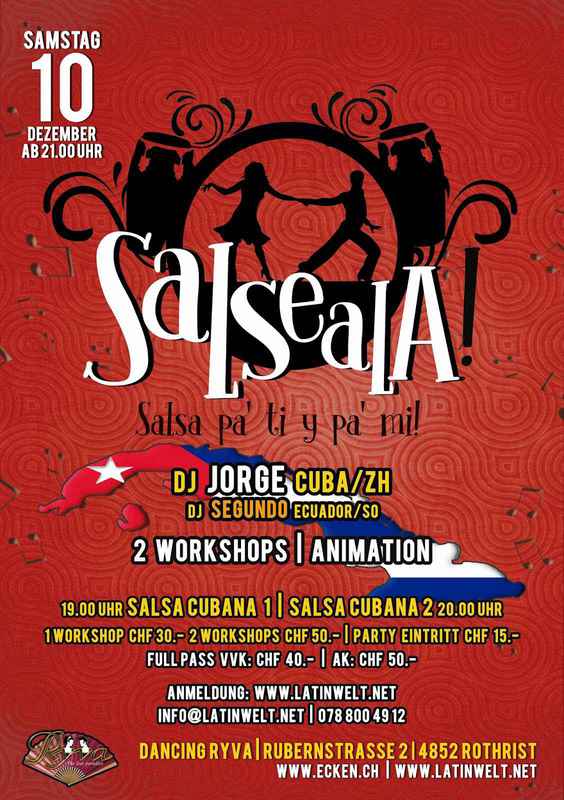 Latin Welt presentiert: ★★SALSEALA! Dj Jorge (Cuba/Zürich) Dj Segundo (Ecuador/Solothurn) ★PROGRAMM ♪ 2 WORKSHOPS 19.00 Uhr Salsa Cubana 1 20.00 Uhr Salsa Cubana 2 "beide Workshops sind für Einsteiger und Fortgeschrittene geeignet, Der Workshops setzt Vorkenntnisse voraus." ♪ Party 21.00 Uhr Party mit Dj Jorge 03.00 Uhr Party Ende ★PREISE CHF 15.- Eintritt Party CHF 30.- Party + 1 Workshop CHF 50.- Party + 2 Workshops FULLPASS VVK: CHF40.- ABENDKASSE: CHF50.- ★Reservationen, Anmeldungen: www.latinwelt.net Haben Sie eine Latinweltkarte oder Latino Card gewähren wir Ihnen gerne einen Discount. ★Informationen: info@latinwelt.net I 078 800 49 12 ★Parkett Tanzboden - über 280 Gratis Parkplatz Wir freuen uns schon auf dieses neue Ereignis! Segundo Valencia 078 800 49 12 - info@latinwelt.net
