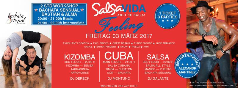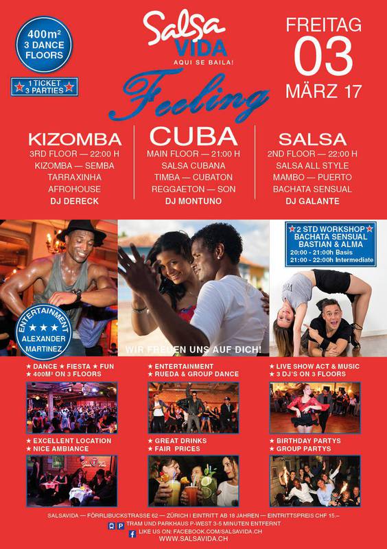 ★★★Friday Night is SALSAVIDA Night★★★ WITH BACHATA SENSUAL WORKSHOPS FROM 20:00 h - 22:00 h Event on Facebook: https://www.facebook.com/events/1823326627941563/ 1 Ticket = 3 Parties!!! ★★★★ FEELING PARTIES★★★★ ★ CUBA ★ SALSA ★ KIZOMBA ★ ★ 03 MÄRZ 2017 ab 21:00 H / SALSAVIDA / ZÜRICH ★ ★ BACHATA SENSUAL WORKSHOPS AB 20:00 H ★ Main Floor CUBA FEELING ab 21:00 H ● MUSIC BY DJ MONTUNO ★Salsa Cubana ★Timba ★Son ★Cubaton ★Bachata ● ENTERTAINMENT BY ALEXANDER MARTINEZ (Cuba) 2nd Floor SALSA FEELING ab 22:00 H ● MUSIC BY DJ GALANTE ★Salsa all Styles ★Mambo ★Puerto ★Bachata Sensual 3rd Floor KIZOMBA FEELING ab 22:00 H ● MUSIC BY DJ DERECK ★Kizomba ★Tarraxinha ★Semba ★Afrohouse VERLOSUNG: 2 TICKETS FÜR SALSAVIDA PARTY ★ 2 STUNDEN WORKSHOPS MIT BASTIAN & ALMA VON SALSABROSA ★ 20:00 H - 21:00 H BACHATA SENSUAL BASIC 21:00 H - 22:00 H BACHATA SENSUAL INTERMEDIATE PREIS 2 STD. WORKSHOPS und PARTIES = CHF 25.- 1 STD. WORKSHOP und PARTIES = CHF 20.- NUR PARTIES = CHF 15.- Wenn du nur die Workshops besuchst, ohne die Partys, bezahlst du CHF 10.- Pro Stunde ● 400m2 PISTA ● 3 DANCE FLOORS ● 3 TOP DJ’S ● 2 BARS ● EXCELLENT LOCATION ● NICE AMBIANCE ● FAIR PRICES ● GREAT DRINKS ● DANCE ● ENTERTAINMENT ● SHOWS ● RUEDA ● FUN ● FIESTAAA! DON’T MISS IT!!! Eine unvergessliche Tanznacht, Spass, Freude und Unterhaltung ist dabei garantiert! Wir freuen uns auf DICH! SALSAVIDA aqui se bailaaa! Weitere Infos: https://www.facebook.com/salsavida.ch/ Infos: franco.g@gmx.ch | 079 273 69 94 Anfahrtsplan Salsavida im Club Silbando an der Förrlibuckstrasse 62 in 8005 Zürich. Achtung: Für Salsavida Gäste, die mit dem Auto anreisen, bitte unbedingt das "Parkaus West" oder "Parkhaus Toni Areal" benutzen, da auf dem Salsavida und Club Silbando-Areal nicht überall geparkt werden darf. Tram Mit dem Tram findest du folgt zu uns: - Nr. 17 bis Förrlibuckstrasse - Nr. 4, 10, 11, 13, 15, 17 bis Escher-Wyss-Platz - Nr. 4 bis Technopark Bus Folgende Busse führen ebenfalls an die Förrlibuckstrasse: - Nr. 32, 33, 34, 46, 72 bis Escher-Wyss-Platz S-Bahn - Nr. 5, 6, 7, 9, 12 bis Bahnhof Hardbrücke Parkmöglichkeiten - Parkhaus Zürich-West an der Förrlibuckstrasse 151 - Parkhaus Toni Areal an der Pfingstweidstrasse 94 - West-Park an der Giessereistrasse - unter der Hardbrücke etc. Wieviele Gehminuten dauert es zum SALSAVIDA? - Escher-Wyss-Platz Salsavida im Club Silbando 6 Minuten - Technopark Salsavida im Club Silbando 6 Minuten - Parkhaus Toni Areal Salsavida im Club Silbando 3 Minuten - Parkhaus Zürich-West Salsavida im Club Silbando 4 Minuten - Bahnhof Hardbrücke Salsavida im Club Silbando 12 Minuten