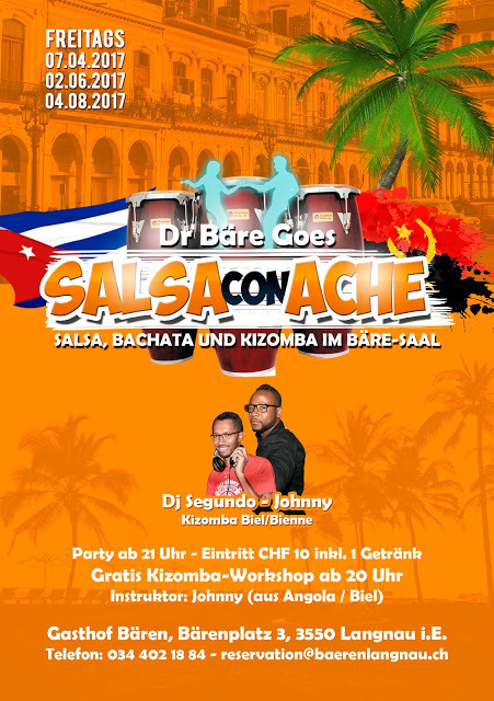 Wenn es heisst « Dr Bäre goes Salsa con Ache», verwandelt sich der Bäre-Saal in einen Tanz-Event der ganz besonderen Art! Es freut uns Sie zu diesem einzigartigen Tanzgenuss auf das Parkett einzuladen. Geniessen Sie in überraschender Atmosphäre Salsa, Bachata und Kizomba mit DJ Segundo Von 20:00 - 21:00 Uhr erwartet Sie ein gratis Kizomba-Workshop Instruktor: Johnny (Angola / Kizomba Biel-Bienne) Party ab 21:00 Uhr bis 00:30 Eintritt: CHF 10.- inkl. ein Getränk (alkoholfrei) Planen Sie zuvor ein feines Nachtessen, dann lassen Sie es uns wissen – gerne halten wir Ihnen einen Platz frei: Telefon: 034 402 18 84 oder reservation@baerenlangnau.ch Herzlich willkommen beim Gasthof Bären mit viel Genuss & Spannung! Adresse: Gasthof Bären, Bärenplatz 3, 3550 Langnau i.E