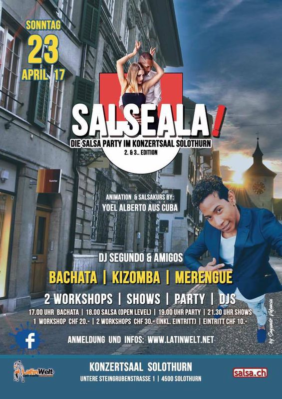 Salsaeala! Die Salsa Party im Konzertsaal Solothurn! 2. Edition Nach einer langen Durststrecke ist der Salsa zurück in der schönsten Barockstadt der Schweiz - Willkommen in Solothurn! Nach dem erfolgreichen und tollen ersten Event im März 2017, findet am Sonntag, 23. April 2017 die nächste Salsa Party "Salseala!" im Konzertsaal Solothurn statt. Salsa - Bachata - Merengue - Kizomba...! Türöffnung 16.30 Uhr STAR GAST AUS CUBA: YOEL ALBERTO! Animation & Salsa Tanzlehrer 2 WORKSHOPS 17.00 - 17.50 Uhr Bachata 18.00 - 18.50 Uhr Salsa 2 WORKSHOPS 17.00 - 17.50 Uhr Bachata (Instruktor: Segundo Valencia aus Ecuador) 18.00 - 18.50 Uhr Salsa Cubana (Instruktor: Yoel Alberto aus Cuba) PREISE WORKSHOPS CHF 20.- 1 Workshop + Party CHF 30.- 2 Workshops + Party PARTY Ab 19.00 - 23.30 Uhr CHF 10.- Eintritt Party SHOWS oder ANIMATION 21.30 Uhr Holz-Tanzboden viele Parkpläzte! Salsaludos! www.latinwelt.net