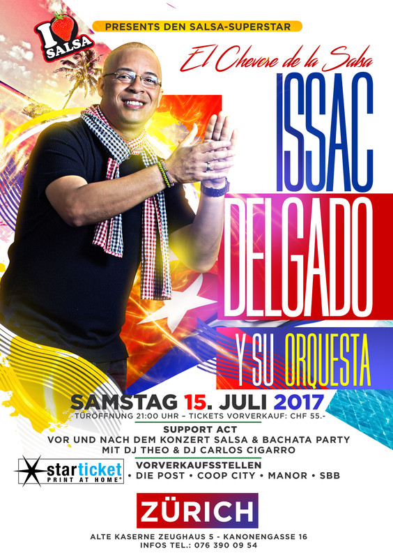 I Love Salsa Switzerland präsentiert den Salsa-Superstar: ISSAC DELGADO y ORQUESTA Live Konzert in Zürich El Chevere De La Salsa - www.issacdelgado.com SAMSTAG 15. JULI 2017 - Türöffnung 21:00h. TICKETS: https://www.starticket.ch/de/tickets/issac-delgado-y-su-orquesta-20170715-2100-alte-kaserne-zurich Starticket - Die Post - Coop City - Manor - SBB ALTE KASERNE Zeughaus 5 Kanonengasse 16 - 8004 ZÜRICH - www.altekaserne.ch BIOGRAFIA: Issac Felipe Delgado-Ramirez, nacio en Marianao, Provincia de La Habana, en el año 1962 y es un cantante Cubano de salsa y timba. Su padre, Luís Delgado, era sastre y su madre, Lina Ramírez, era actriz, bailarina y cantante en el Teatro Musical de La Habana. Con diez años entró en el Conservatorio Amadeo Roldán donde estudió violoncello, un instrumento que no le interesaba. Dos años después dejó el conservatorio y se dedicó al deporte en especial al fútbol recibiéndose de grado en Educación Física. Con 18 años Issac se unió al grupo "Proyecto" por petición de Gonzalo Rubalcaba. Este hecho despertó nuevamente su innato amor por la música. En este momento se decidió a estudiar técnica vocal con una de las mejores profesoras en Cuba, Mariana De Gonish. También se matriculó en la escuela para músicos profesionales Ignacio Cervantes. En 1983 empezó su carrera profesional llegando a ser uno de los miembros de la Orquesta de Pancho Alonso. Empezó a viajar por el mundo con la orquesta y grabó su primer dico compacto (CD). En 1987 se convierte en el vocalista de "Galaxia" y graba su segundo CD. Un año después lidera el grupo "NG La Banda" como vocalista. Con este grupo consigue una gran fama. Con esta banda grabó tres CD y fue galardonado con el premio EGREM 1990-1991. En 1991 crea su propia banda y graba el CD, Dando la Hora bajo la dirección artística de Gonzalo Rubalcaba. Este álbum recibe el premio EGREM 1992. Posteriormente graban el CD Con Ganas que recibe el preio EGREM 1993. En 1994 vuelve a recibir este premio por El Chévere de la Salsa y El Caballero del Son. Por esta misma época, una telenovela cubana "El año que viene", tenía como tema principal la canción de Issac "A lo mejor para el año que viene". Viaja a Estados Unidos donde actúa en el 'Festival de Salsa' en el neoyorquino Madison Square Garden con Celia Cruz, José Alberto "El Canario" y Grupo Niche. En Nueva York grabó otro álbum, titulado "Otra Idea". En 1997 actúa en el festival 'Guerra de la Salsa' con La India, Rey Ruiz y Tony Vega. En el 2006 cruzó la frontera EE.UU.-México y accedió a Laredo, Texas llevando con él sólo a su familia (su mujer Massiel Valdés, y sus dos hijas Dalina y Alessia), talento y reputación. Su último disco fue lanzado en el 2010 titulado Love. Ahora vive en Tampa, Florida. En marzo del 2013, tras siete años sin visitar su país, regresa a La Habana debido a una invitación que le hace el cantautor Silvio Rodríguez y realiza junto a él un concierto en el barrio Tamarindo, del municipio Diez de Octubre. Actualmente renueva su presencia en la escena musical cubana, realizando duos con agrupaciones como Gente de Zona y participando en diversos festivales. DISCOGRAFIA: Dando la hora (1991) Con ganas (1993) Chevere de la Salsa/El caballero del Son (1994) El Año Que Viene (1995) Exclusivo Para Cuba/Otra Idea (1997) Desde Europa Con Sabor (La Primera Noche) (1998) Los Grandes Éxitos de Isaac Delgado/Malecón (2000) La Fórmula (2001) Versos en el Cielo (2002) Prohibido (2005) En Primera Plana (2007) Así soy (2008) L-O-V-E (2010) Supercubano (2011) Made in Habana (2016) ---------------------------------------------------------------- INFOS & TICKETS https://www.starticket.ch/de/tickets/issac-delgado-y-su-orquesta-20170715-2100-alte-kaserne-zurich theo.terzis@ilovesalsa.ch oder 076 390 09 54 Tickets Preis: Vorverkauf CHF 55.-
