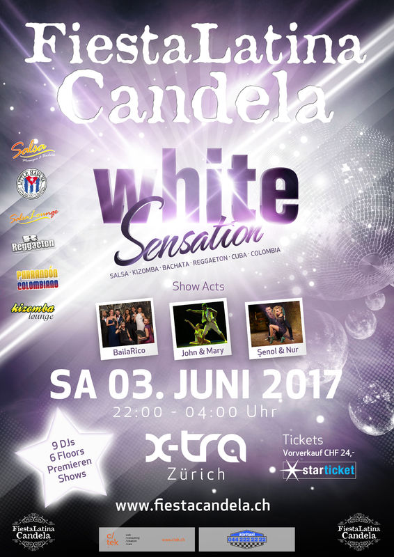 Samstag, 03. Juni 2017 ab 22:00h im X-TRA am Limmatplatz Zürich Fiesta Latina Candela – White Sensation Show-Premieren, Live-Musik und sehr viel Party! Eine abwechslungsreiche Reise durch sechs verschiedene Welten feinster karibischer Rhythmen wie Salsa, Son, Kizomba, Bachata, Reggaeton, Timba, Cumbia bis hin zu Vallenato. Shows mit Senol & Nur aus Ankara, John & Mary aus Basel/Freiburg i.B. und Baila Rico aus Zürich. Unser Guest-DJ dieses Abends ist DJ Mambito aus Freiburg i.B. Ausserdem legen auf: DJ Luis G, DJ U.S.Thaler, DJ Cochano, DJ Nando, DJ Jorge Romay, DJ Kronix, DJ O'Filosofo und DJ Benji.