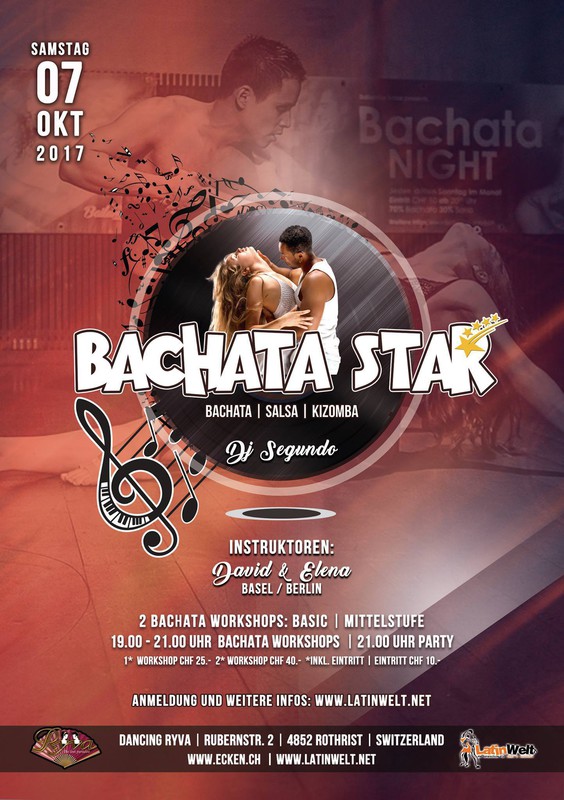 Latin Welt präsentiert: ★★Bachata Star! Dj Segundo & Amigos La Mejor Fiesta de Bachata en Suiza. Sei dabei und geniesse mit uns einen magischen, romantischen Tanzabend mit der besten Bachata Musik jeder Richtung, von den klassischen Stücken bis hin zu den modernen, in Spanisch wie auch in Englisch. Natürlich sollen die Salsa- und Kizomba-Liebhaber unter Euch auch nicht zu kurz kommen, um Abwechslung ins Repertoire zu bringen. Wir garantieren einen unvergesslichen Abend! BACHATA - KIZOMBA - SALSA..! ★PROGRAMM ♪ 2 WORKSHOPS 19.00 Uhr Bachata Basic Level 20.00 Uhr Bachata Intermediate Level Instruktoren: David & Elena (Basel / Berlin) ♪ Party 21.00 Uhr Party 02.30 Uhr Party Ende ★PREISE CHF 10.- Eintritt Party CHF 25.- Party + 1 Workshop CHF 40.- Party + 2 Workshops Haben Sie eine Latinweltkarte oder Latino Card gewähren wir Ihnen gerne einen Discount. ★Informationen, Reservationen, Anmeldungen: www.latinwelt.net ★Parkett Tanzboden - über 280 Gratis Parkplatz Wir freuen uns schon auf dieses neue Ereignis! Latinwelt Team