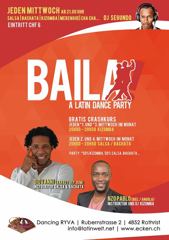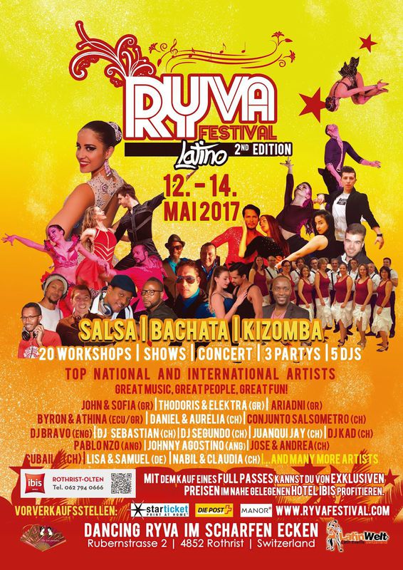 RYVA the Lost Paradise Presents: Dj Segundo und Amigos ★ BAILA SALSA, BACHATA, KIZOMBA... PARTY! A Latin Dance Party! ★Jeden Mittwoch startet unsere Latin Party! Am 1. und 3. Mittwoch liegt der Fokus auf Kizomba mit dem Instruktor und Dj Nzo Pablo Am 2. und 4. Mittwoch liegt der Fokus auf Salsa & Bachata mit dem Instruktor und Giovanni Paniagua Salsa/Bachata/Kizomba Crashkurs zum Start ab 20:00 Uhr Der Kurs ist für Einsteiger geeignet. ★Party ab 21:00h Eintritt CHF 6.- Erleben Sie schöne und glückliche Momente – jeweils Dienstag bis Samstag von 21:00 Uhr bis 2:00 Uhr. Nach dem Essen im Restaurant oder in der Pizzeria Fratelli schenken wir Ihnen den Eintritt. ★Parkett Tanzboden ★über 280 Gratis Parkplatz Dancing RYVA im Scharfen Ecken ★weitere Events unter: http://www.djdonsega.com/p/agenda-2017.html Wir freuen uns auf Ihren Besuch - Jeden Mittwoch. Kontakt Dancing RYVA: Roger von Arx Tel.: 062 794 13 20 Kontakt Latinwelt (Dj Segundo): www.latinwelt.net info@latinwelt.net