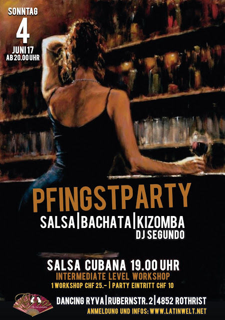 Latin Welt präsentiert: ★★PFINGSTPARTY SALSA, BACHATA, KIZOMBA..! Dj Segundo & Amigos Sei dabei und geniesse mit uns einen magischen Tanzabend mit der besten Salsa, Bachata, Kizomba Musik jeder Richtung, von den klassischen Stücken bis hin zu den modernen, in Spanisch wie auch in Englisch. SALSA -BACHATA - KIZOMBA..! ★PROGRAMM ♪ 1 WORKSHOPS 19.00 Uhr Salsa Cubana Open Level Instruktor: Segundo ♪ Party 20.00 Uhr Party 02.30 Uhr Party Ende ★PREISE CHF 10.- Eintritt Party CHF 25.- Party + 1 Workshop Haben Sie eine Latinweltkarte oder Latino Card gewähren wir Ihnen gerne einen Discount. ★Informationen, Reservationen, Anmeldungen: www.latinwelt.net ★Parkett Tanzboden - über 280 Gratis Parkplatz Wir freuen uns schon auf dieses neue Ereignis! Latinwelt Team