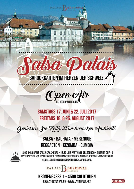 Palais Besenval Solothurn präsentiert: ★★SALSA PALAIS OPEN AIR - Dj Segundo Salsa, Bachata, Merengue, Reggaeton, Kizomba, Cumbia... Tanzfläche innen und draussen! Zeit zum Geniessen! Zeit zum Feiern! Willkommen im Palais Besenval Geniessen Sie Zeitgeist im barocken Ambiente. Treten Sie ein und lassen Sie sich von der über 300-jährigen Geschichte unseres Hauses verzaubern. In diesem barocken Ambiente laden wir Sie ein, zu lateinamerikanischen Klängen zu tanzen. Lassen Sie sich zudem von unseren auserlesenen Tapas-Kreationen verwöhnen und geniessen Sie dabei den direkten Blick auf die Aare. ★Zeit: 18.00 Uhr Gratis Salsa Crashkurs 18.30 Uhr Party bis 02.30 Uhr ★Preis Eintritt CHF 10.- inklusive Salsa Crashkurs 30 Min. ★Informationen: - Tanzflächen innen und aussen auf der schönen Terrasse mit Blick auf die Aare - Der Event findet bei jeder Witterung statt. - 5 Minuten zu Fuss vom Hauptbahnhof Solothurn - Verschiedene Parkmöglichkeiten (z.B. Parkhaus Baseltor 4 Min., Parkhaus Berntor 6 Min.) Wir freuen uns schon auf dieses neue Ereignis!