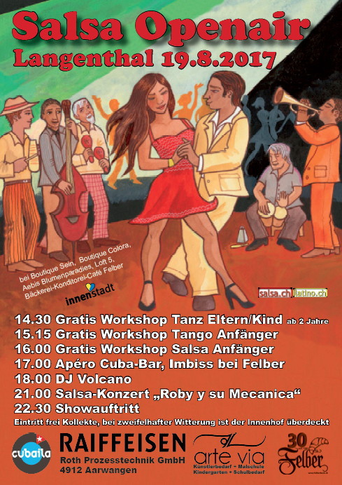 14.30 Gratis Workshop Tanz Eltern/Kind ab 2 Jahre 15.15 Gratis Workshop Tango Anfänger 16.00 Gratis Workshop Salsa Anfänger 17.00 Apéro Cuba-Bar, Imbiss bei Felber 18.00 DJ Volcano 21.00 Salsa-Konzert „Roby y su Mecanica“ 22.30 Showauftritt Eintritt frei Kollekte, bei zweifelhafter Witterung ist der Innenhof überdeckt