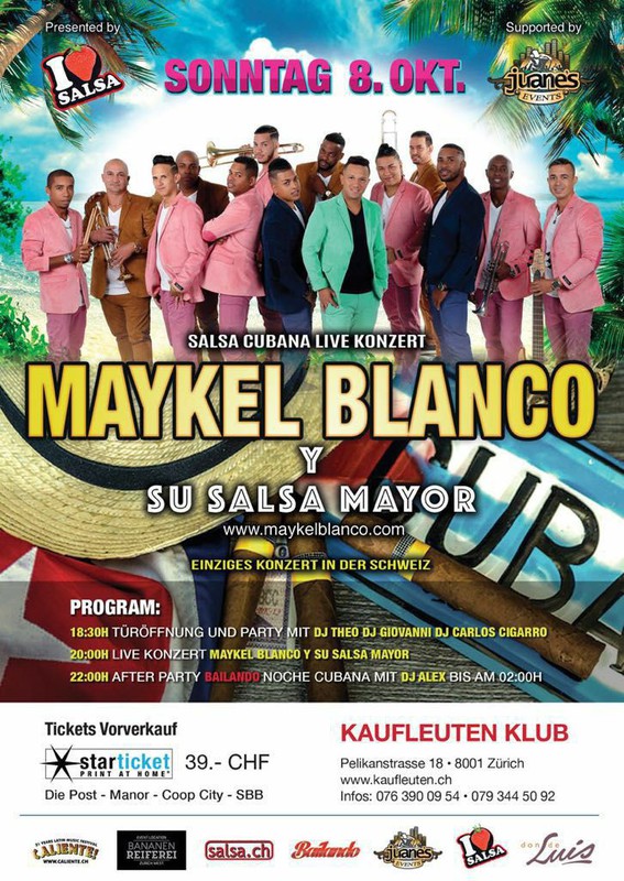 https://www.starticket.ch/de/tickets/maykel-blanco-y-su-salsa-mayor-20171008-2000-kaufleuten-klub-zurich " I Love Salsa Switzerland präsentiert den Salsa-Superstar " ★ MAYKEL BLANCO y SU SALSA MAYOR (Cuba) Live ★ 14 Musiker - www.maykelblanco.com ★ SONNTAG 8. OKTOBER 2017 Einziges Konzert in der Schweiz ★ MAYKEL BLANCO Konzert Supported by JUANES PARTY ★ www.juanesevents.ch ★ PROGRAM: 18:30h Türöffnung 20:00h Live Konzert Maykel Blanco y Su Salsa Mayor 22:00h After Party BAILANDO Noche Cubana mit DJ Alex ★ TICKET: 39.- CHF Vorverkauf, ( Starticket, Die Post, Coop City, Manor ) 45.- CHF Abendkasse ( Kaufleuten ) ★ https://www.starticket.ch/de/tickets/maykel-blanco-y-su-salsa-mayor-20171008-2000-kaufleuten-klub-zurich ★ SUPPORT ACT: DJ Theo, Giovanni, DJ Carlos Cigarro, DJ Alex vor und nach dem Konzert Salsa Cubana Party ★ LOKAL: KAUFLEUTEN KLUB Pelikanstrasse 18, 8001 Zürich, www.kaufleuten.ch INFOS: 076 390 09 54 & 079 344 50 92 ★ YOUTUBE: https://youtu.be/llIZRZXmZ8A https://youtu.be/6EJ6c0k2Xao https://youtu.be/tdZvyiU6uEQ
