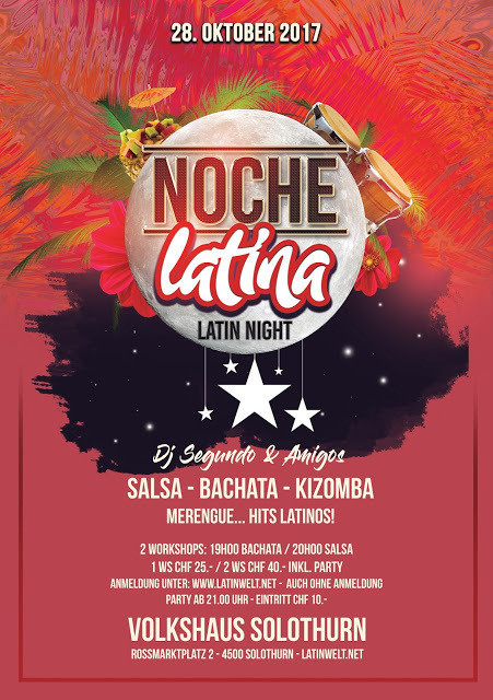 Latinwelt präsentiert "NOCHE LATINA" Salsa, Bachata, Kizomba... Latin Hits! Dj Segundo & Amigos 2 Workshops / Djs / Party / Animation Zeit zum Geniessen! Zeit zum Feiern! ★Zeit: 19.00 - 19.50 Uhr Workshop Bachata 20.00 - 20.50 Uhr Workshop Salsa 21.00 bis ca. 01.00 Uhr Party ★Preis CHF 10.- Eintritt CHF 25.- 1 Workshop + Party CHF 40.- 2 Workshops + Party ★Aufgrund von Anlassbewilligung die Party ist bis ca 01.00 Uhr ★Informationen: - Tanzflächen, Holzboden - 5 Minuten zu Fuss vom Hauptbahnhof Solothurn - Verschiedene Parkmöglichkeiten (z.B. Parkhaus Dornacherplatz 2 Minuten, Parkhaus Berntor 6 Min.) ★ Samstags: 28. Oktober / 11. November / 9. Dezember 2017 Wir freuen uns schon auf dieses neue Ereignis!