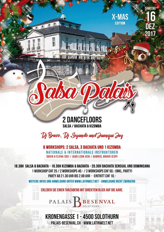 Palais Besenval Solothurn präsentiert: ★Salsa Palais X-Mas Edition! 2 Dancefloors - 6 Workshops - 3 Djs 1. Floor: Salsa & Latino / 2. Floor Bachata & Kizomba Dj Bravo (Spanien) 🇧🇴/🇪🇸 , Dj Segundo Ecuador 🇪🇨/🇨🇭 und Juanqui Jay Ecuador 🇪🇨/🇨🇭 Salsa, Bachata, Kizomba, Merengue, Reggaeton, Cumbia... Zeit zum Geniessen! Zeit zum Feiern! Willkommen im Palais Besenval Geniessen Sie Zeitgeist im barocken Ambiente. Tretet ein und lasst Euch von der über 300-jährigen Geschichte des Palais Besenval Solothurn verzaubern. In diesem barocken Ambiente laden wir Euch ein, zu lateinamerikanischen Klängen zu tanzen. Lasst Euch zudem von den auserlesenen Tapas-Kreationen verwöhnen und geniesst dabei den direkten Blick auf die Aare. ★Zeit: 18.00 Uhr Türöffnung 18.30 Uhr Workshops: Salsa by Gabriel / Bachata Sensual by David & Elena 19.30 Uhr Workshops: Kizomba by Juanqui / Bachata Dominicana by Gabriel 20.30 Uhr Workshops: Bachata Sensual by David & Elena / Bachata Dominicana by Gabriel 21.30 Uhr Partybeginn ★Instruktoren: David & Elena (Schweiz/Deutschland) 🇨🇭🇩🇪 Gabriel Bravo Star Artist (Spanien) 🇪🇸 Juan Leon (Schweiz) 🇨🇭 ★Preis CHF 25.- 1 Workshop + Party CHF 35.- VVK 2 Workshops + Party / AK 40.- CHF 45.- VVK 3 Workshops + Party / AK 50.- CHF 10.- Eintritt Party Die Workshops setzen Vorkenntnisse voraus. Anmeldung unter: www.latinwelt.net (nicht zwingend) ★Informationen: - Garderobe obligatorisch CHF 2.- - 5 Minuten zu Fuss vom Hauptbahnhof Solothurn - Verschiedene Parkmöglichkeiten (z.B. Parkhaus Baseltor 4 Min., Parkhaus Berntor 6 Min.)