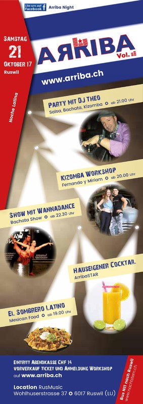 "Latin Party made from Salsa People for Salsa People" SALSA, BACHATA Y KIZOMBA BY DJ THEO Auf euch wartet DJ Theo & Guest:-)..wir freuen uns megaaa! Programm 19:00 Uhr - Mexikanischer Food 20:00 Uhr - Kizomba Beginner Workshop mit Fernando y Miriam 21:00 Uhr - Party Sound mit DJ Theo 22.30 Uhr - Bachata Show von WannaDance Workshop und Eintritt Frühbuchen UND Geld sparen!! JETZT auf www.arriba.ch!! Wo Eventlokal Rusmusic Wolhuserstrasse 37 6017 Ruswil LU Wir freuen uns sehr auf euch!! Euer Arriba-Team