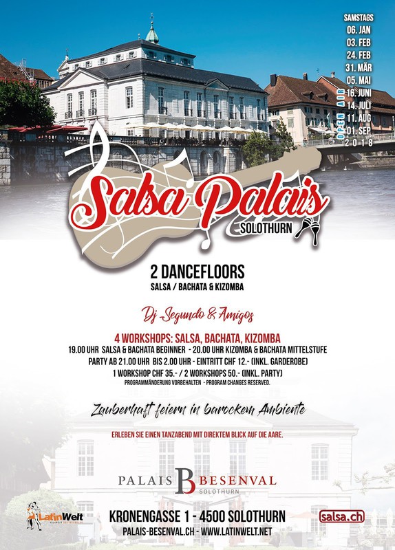 Palais Besenval Solothurn und Latinwelt bedanken sich bei allen für die schönen Abenden im 2017 und präsentieren für das neue Jahr schon die nächsten Salsa Palais Events: ★ Samstags: 6. Januar 2018 / 3. Februar 2018 ★★SALSA PALAIS! Dj Segundo & Amigos Salsa, Bachata, Kizomba, Merengue, Reggaeton... 2 Dancefloors - 4 Workshops - 3 Djs 1. Floor: Salsa & Latino 2. Floor: Bachata & Kizomba Zeit zum Geniessen! Zeit zum Feiern! Willkommen im Palais Besenval Geniesse Zeitgeist im barocken Ambiente. Trete ein und lasse dich von der über 300-jährigen Geschichte des Palais Besenval verzaubern. In diesem barocken Ambiente laden wir dich ein, zu lateinamerikanischen Klängen zu tanzen. ★Zeit: 18.30 Uhr Türöffnung 19.00 Uhr Workshops: Salsa & Bachata Anfänger 20.00 Uhr Bachata und Kizomba Mittelstufe 21.00 Uhr Partybeginn 02.00 Uhr Partyschluss ★ Die Workshops setzen Vorkenntnisse voraus. Anmeldung unter: http://www.latinwelt.net/p/anmeldung-events.html (Nicht zwingend) ★Preis CHF 45.- Vorverkauf FULL PASS (alle Workshops + Party) / Abendkasse 50.- CHF 30.- Vorverkauf 1 Workshops + Party / Abendkasse 40.- CHF 12.- Eintritt Party (inklusive Garderobe) Haben Sie eine Latinweltkarte oder Latino Card gewähren wir Ihnen gerne einen Discount. ★Informationen: - Hast du eine Latinwelt oder Latino Card, profitierst du von einem Rabatt. - 2 Garderobe obligatorisch CHF 2.- - 5 Minuten zu Fuss vom Hauptbahnhof Solothurn - Verschiedene Parkmöglichkeiten (z.B. Parkhaus Baseltor 4 Min., Parkhaus Berntor 6 Min.) - Verpflegungsmöglichkeit im Restaurant Palais Besenval ★Adresse: Palais Besenval, Kronnengasse 1 - 4500 Solothurn