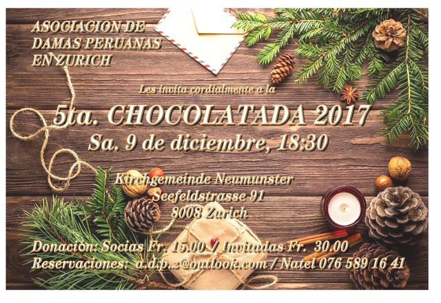 Asociación de Damas Peruanas en Zürich ADPZ Invita cordialmente a Celebrar la 5ta. Chocolatada 2017 de la asociación en apoyo de proyectos solidarios en el Perú Sabado 9 de Diciembre a partir de las 18:30 Kirchgemeinde Neumünster Seefeldstrasse 91, 8008 Zürich Participacion Donativa Invitados 30.00 CHF Socios 15.00 CHF Reservaciones a.d.p.z@outlook.com Tel +41 (0) 76 589 16 41