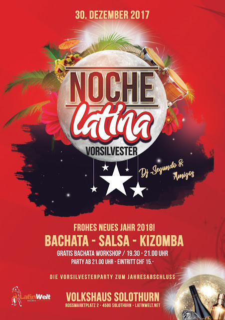 Latinwelt präsentiert : "NOCHE LATINA VORSILVESTER EDITON" Die Vorsilvesterparty zum Jahresabschluss! Feier mit uns am Samstag, 30. Dezember 2017, die Vorsilvesterparty im Volkshaus Solothurn. Zeit zum Geniessen! Zeit zum Feiern! Bereits ab 19:30 Uhr findet ein GRATIS BACHATA WORKSHOP statt. Dj Segundo verwöhnt Euch an diesem Abend mit seinem grossen Repertoire von Salsa, Bachata, Kizomba Reggaeton, Merenge, Cumbia und Latin Hits. ★ Gratis Bachata Workshop / 90 Minuten ★ Instuktoren: Latinwelt Tanzschule Solothurn ★ Zeit: 19.30 - 21.00 Uhr Workshop Bachata Open Level Hinweis: Der Workshop setzt Vorkenntnisse voraus. 21.00 bis 02.00 Uhr Party ★ Preis CHF 15.- Party inkl. Gratis Workshop ★ Informationen: - Tanzfläche mit Holzboden - Sitzmöglichkeiten - Bar - 5 Minuten zu Fuss vom Hauptbahnhof Solothurn - Verschiedene Parkmöglichkeiten (z.B. Parkhaus Berntor 2 Min.) Wir freuen uns, mit Euch zu feiern!