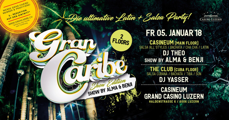 Grand Casino Luzern und I love Salsa Switzerland präsentieren: GRAN CARIBE | Show Edition Die ultimative Latin und Salsa Party in der Zentralschweiz auf 2 Dance Floors, beide Rauchfrei FLOOR 1 - CASINEUM, Theocharis Terzis aka DJ Theo Salsa All Styles / Bachata / Mambo / Cha Cha Cha / Latin Hits SHOW BY Alma La Base & Benjamin Zellweger aka Benji FLOOR 2 - THE CLUB, DJ Yasser Ramos Salsa Cubana / Timba / Son / Bachata / Kizomba / Salsa Romantica Registriere Dich jetzt als Gran Caribe Member und erhalte an jeder Gran Caribe 5.- Fr. Einlassreduktion, auch an special editions. WWW.GRANCARIBE.CH Eingang über das Foyer des Gran Casino Luzern Türöffnung: 22 Uhr Für Lounge Reservationen und Infos erreichbar unter: reservation@casineum.ch oder online unter: www.casineum.ch CASINEUM @ GRAND CASINO LUZERN Haldenstrasse 6, 6006 Luzern