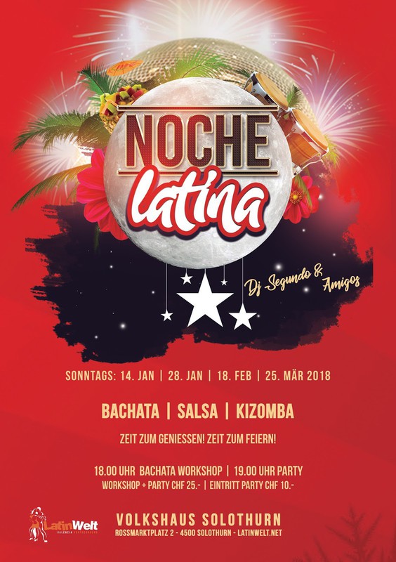Latinwelt präsentiert : "NOCHE LATINA" Feier mit uns am Sonntag, die Noche Latina Party im Volkshaus Solothurn. Zeit zum Geniessen! Zeit zum Feiern! Bereits ab 18.00 Uhr findet ein BACHATA WORKSHOP statt. Dj Segundo verwöhnt Euch an diesem Abend mit seinem grossen Repertoire von Salsa, Bachata, Kizomba Reggaeton, Merenge, Cumbia und Latin Hits. ★ Bachata Workshop / 60 Minuten ★ Instuktoren: Latinwelt Tanzschule Solothurn ★ Zeit: 18.00 - 19.00 Uhr Workshop Bachata Open Level Hinweis: Der Workshop setzt Vorkenntnisse voraus. 19.00 Uhr Party ★ Preis CHF 10.- Party CHF 25.- 1 Workshop + Party ★ Informationen: - Tanzfläche mit Holzboden - Sitzmöglichkeiten - Bar - 5 Minuten zu Fuss vom Hauptbahnhof Solothurn - Verschiedene Parkmöglichkeiten (z.B. Parkhaus Berntor 2 Min.) Wir freuen uns, mit Euch zu feiern!