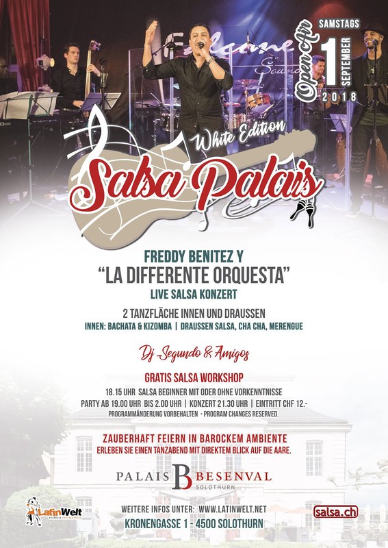 ★ Samstag, 1. September 2018 ⚠️Achtung: Aufgrund des schlechten Wetters am Samstag findet das Salsa Konzert nicht statt. Die Party mit DJs findet drinnen auf 2 Tanzflächen statt. Latinwelt und Palais Besenval Solothurn präsentieren: ★★SALSA PALAIS - “White Edition” 2 Tanzflächen 1. Floor: Salsa & Latino 2. Floor: Bachata und Kizomba Dj Segundo & Amigos Salsa, Bachata, Kizomba, Merengue, Reggaeton..! Zeit zum Geniessen! Zeit zum Feiern! ★Zeit: 18.00 Uhr Türöffnung 18.15 Uhr Gratis Salsa Workshops, für Anfänger 19.00 Uhr bis 02.00 Uhr Party ★Preis: CHF 12.- Eintritt Party ★Informationen: - Der Event findet bei jeder Witterung statt. - 5 Minuten zu Fuss vom Hauptbahnhof Solothurn - Verschiedene Parkmöglichkeiten (z.B. Parkhaus Baseltor 4 Min., Parkhaus Berntor 6 Min.) - Verpflegungsmöglichkeit im Restaurant Palais Besenval weitere Informationen unter www.latinwelt.net Anmeldung nicht zwingend. http://www.latinwelt.net/2018/08/salsa-palais-white-edition-open-air.html