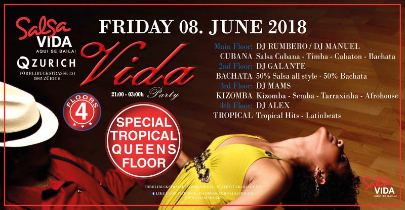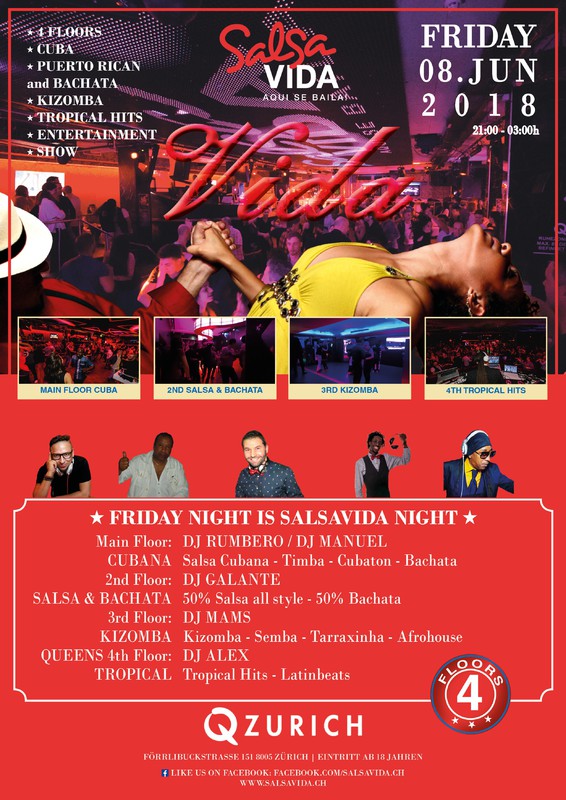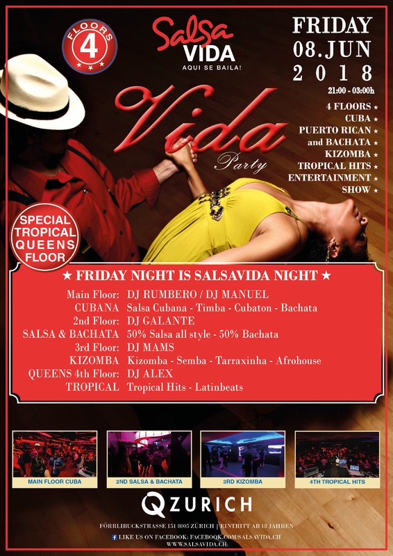 ★Friday Night is SALSAVIDA Night★ ==★ NEW ★==★ NEW ★==★ NEW ★== ★VIDA Parties NEW on 4 FLOORS★ ★ CUBA ★ PUERTO RICAN ★ BACHATA ★ KIZOMBA ★ TROPICAL HITS Event on Facebook: https://www.facebook.com/events/954597584687781/ Main Floor ab 21:00 H ★ MUSIC BY DJ RUMBERO / DJ MANUEL Salsa Cubana, Timba, Son, Cubaton, Bachata 2nd Floor ab 21:00 H ★ MUSIC BY DJ GALANTE 50% Salsa ALL Style - 50% Bachata 3rd Floor KIZOMBA 21:00 H ★ MUSIC BY DJ MAMS Kizomba, Tarraxinha, Semba, Afrohouse ==★ NEW ★==★ NEW ★==★ NEW ★== 4th Floor TROPICAL 21:00 H ★ MUSIC BY DJ ALEX Tropical Hits - Latinbeats VERLOSUNG: ★ 2 TICKETS FÜR SALSAVIDA PARTY DON’T MISS IT!!! Eine unvergessliche Tanznacht, Spass, Freude und Unterhaltung ist dabei garantiert! Über 700 Parkplätze stehen auf dem Dach im P-West Parkhaus zur Verfügung. Wir freuen uns auf DICH! SALSAVIDA aqui se bailaaa! Saludos Francesco & Salsavida Team Alle Salsavida Events auf einen Blick online auf Facebook: https://www.facebook.com/pg/salsavida.ch/events/?ref=page_internal oder auf salsa.ch http://salsa.ch/users/54ff10bf7669720cff290000/events SALSAVIDA im Q CLUB ZURICH Förrlibuckstrasse 151, 8005 Zürich
