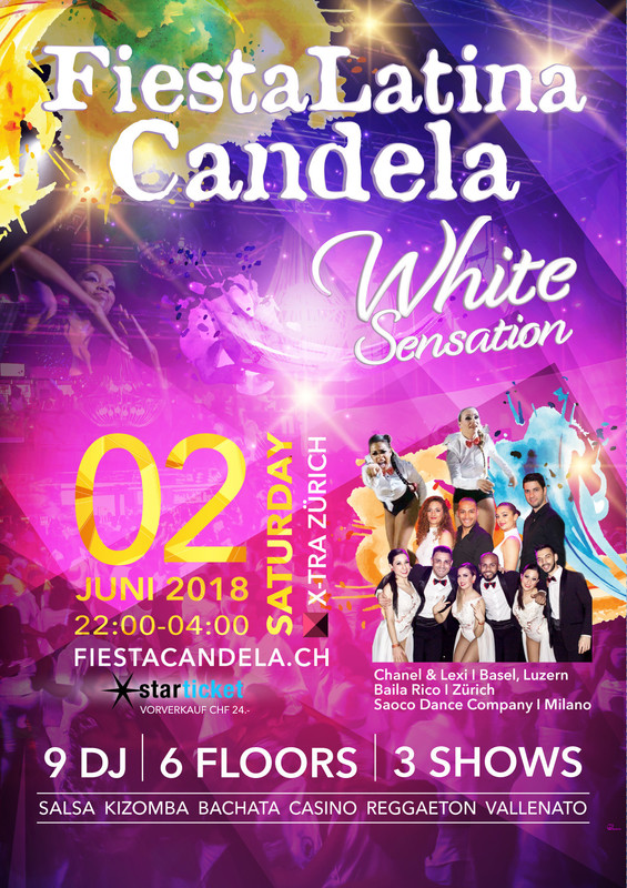 Dresscode "WHITE"! Show-Premieren, Live-Musik und sehr viel Party! Eine abwechslungsreiche Reise durch sechs verschiedene Welten feinster karibischer Rhythmen wie Salsa, Son, Kizomba, Bachata, Reggaeton, Timba, Cumbia bis hin zu Vallenato. Shows mit Saoco Dance Company aus Milano, Chanel und Lexi aus Basel und Luzern sowie Baila Rico aus Zürich. Unser Guest-DJ dieses Abends ist DJ Sergi aus Paris. Ausserdem legen auf: DJ Mambito, DJ U.S.Thaler, DJ Liliana, DJ Nando, DJ Jorge Romay, DJ Kronix, DJ Xavix und DJ Benji.