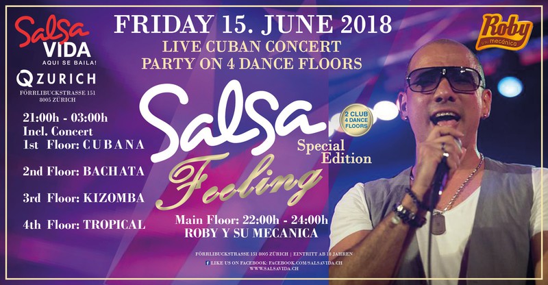 SALSAVIDA präsentiert das erste kubanisches Konzert im Q ZURICH Club mit Party auf 4 Dancefloors! Event on Facebook: https://www.facebook.com/events/590970691259346/ ★BIENVENIDOS EN CUBA★ Wir freuen uns sehr darauf das erste kubanisches Konzert vom ROBY Y SU MECANICA dem großartigen SALSAVIDA Publikum zu präsentieren. Der Q ZURICH Club bietet eine hervorragende Sound -und Lichtanlage für ein perfektes CUBAN FEELING, grosse Tanzflächen, viele Lounges und 2 Bars mit professionellen Barkeepers. Geniesse deinen Mojito oder Cuba Libre und fühle dich wie in Cuba! Während und nach dem Konzert sind die weiteren 3 Floors BACHATA, KIZOMBA und der neue Floor im QUEENS Club, der TROPICAL Floor mit Latin Hits Musik bis 03:00 Uhr morgens für dich zum Feiern geöffnet. Wir freuen uns auf einen speziell schönen und tanzreichen Abend mit dir! SALSAVIDA aqui se bailaaa! Eine unvergessliche Tanznacht, Spass, Freude und Unterhaltung ist dabei garantiert! === ★ === ★ === ★ === Main Floor ab 21:00 H Konzert startet um 22 Uhr bis 24 Uhr ★ ROBY Y SU MECANICA ★ MUSIC BY TBD Salsa Cubana, Timba, Son, Cubaton, Bachata 2nd Floor ab 21:00 H ★ MUSIC BY DJ NÕNÕ 100% Bachata 3rd Floor KIZOMBA 21:00 H ★ MUSIC BY DJ XAVIX Kizomba, Tarraxinha, Semba, Afrohouse ==★ NEW ★==★ NEW ★==★ NEW ★== 4th Floor TROPICAL 21:00 H ★ MUSIC BY DJ TBD Tropical Hits - Latinbeats Wir freuen uns auf DICH! Francesco & Salsavida-Team Über 700 Parkplätze stehen auf dem Dach im P-West Parkhaus zur Verfügung. Infos: francesco.salsavida@gmail.com www.facebook.com/salsavida.ch Lounge reservieren: www.q-zurich.ch SALSAVIDA im Q CLUB ZURICH Förrlibuckstrasse 151, 8005 Zürich |Willkommen| Bienvenidos | Welcome | Benvenuto | Bienvenue |