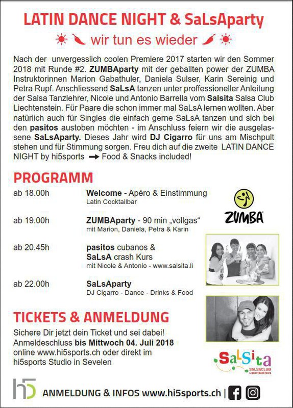 Nach der unvergesslich coolen Premiere 2017 starten wir den Sommer 2018 mit Runde #2. ZUMBAparty mit der geballten power der ZUMBA Instruktorinnen Marion Gabathuler, Daniela Sulser, Karin Sereinig und Petra Rupf. Anschliessend SaLsA tanzen unter proffessioneller Anleitung der Salsa Tanzlehrer, Nicole und Antonio Barrella vom Salsita Salsa Club Liechtenstein. Für Paare die schon immer mal SaLsA lernen wollten. Aber natürlich auch für Singles die einfach gerne SaLsA tanzen und sich bei den pasitos austoben möchten – im Anschluss feiern wir die ausgelassene SaLsAparty. Dieses Jahr wird DJ Cigarro für uns am Mischpult stehen und für Stimmung sorgen. Freu dich auf die zweite LATIN DANCE NIGHT by hi5sports - Food & Snacks included!