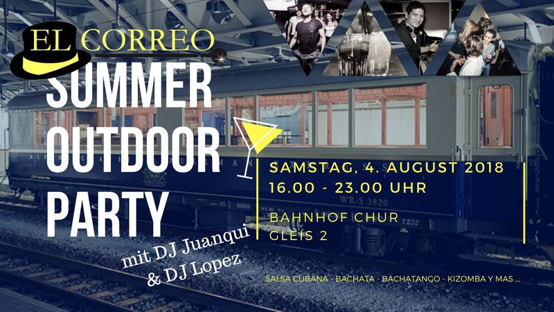 EL CORREO GOES OUTSIDE! Wir machen eine Pause von der Sommerpause und feiern draussen mit einem einzigartigen Event! WAS: Outdoor-Tanzfläche auf dem Perron mit coolen Drinks direkt von der PianoBar, die rollende Bar auf Schienen. WO: Bahnhof Chur, Gleis 2 -> wir bleiben im Stillstand ganz am Ende von Gleis 2 SOUND: DJ Manuel (DiscoFox), DJ Juanqui und DJ Lopez (Salsa) CLUBBEITRAG: 8.- Lasst uns draussen an der frischen Luft tanzen! Wir freuen uns auf Euch. Wenn es wieder heisst ... ____________________________________________________ Heisse Latinorhythmen zu coolen Drinks. … da geht die Post ab! (der BarWagen bleibt aber stehen. ;-) ) SALSA CUBANA - BACHATA - BACHATANGO - KIZOMBA Y MAS ...
